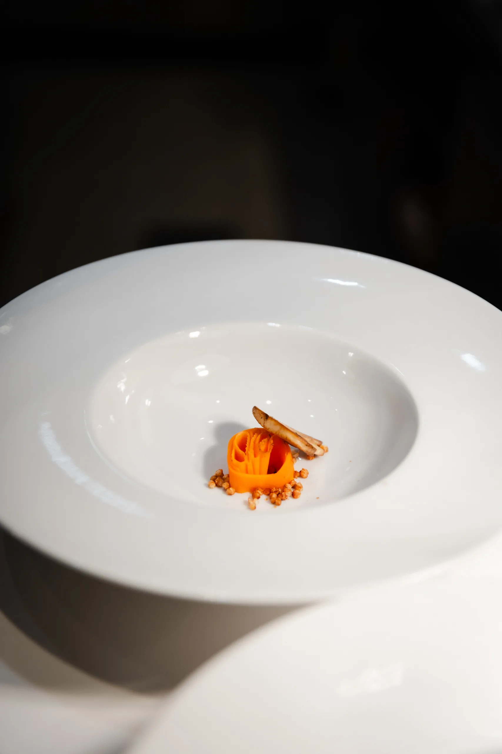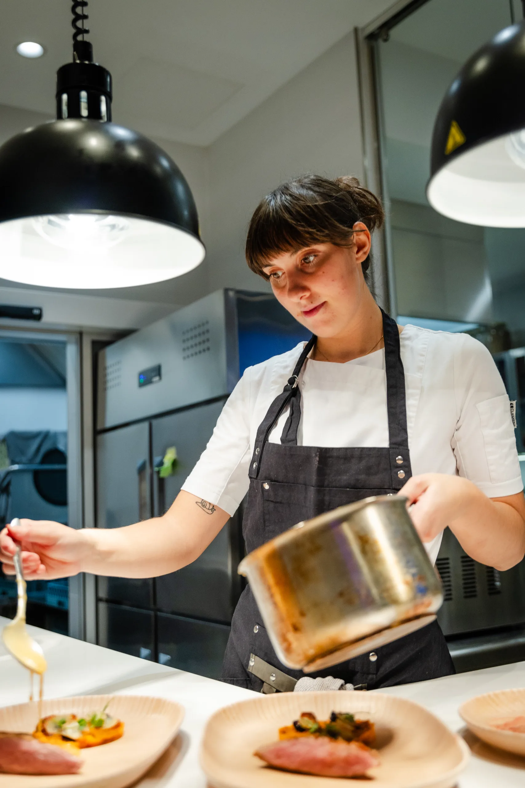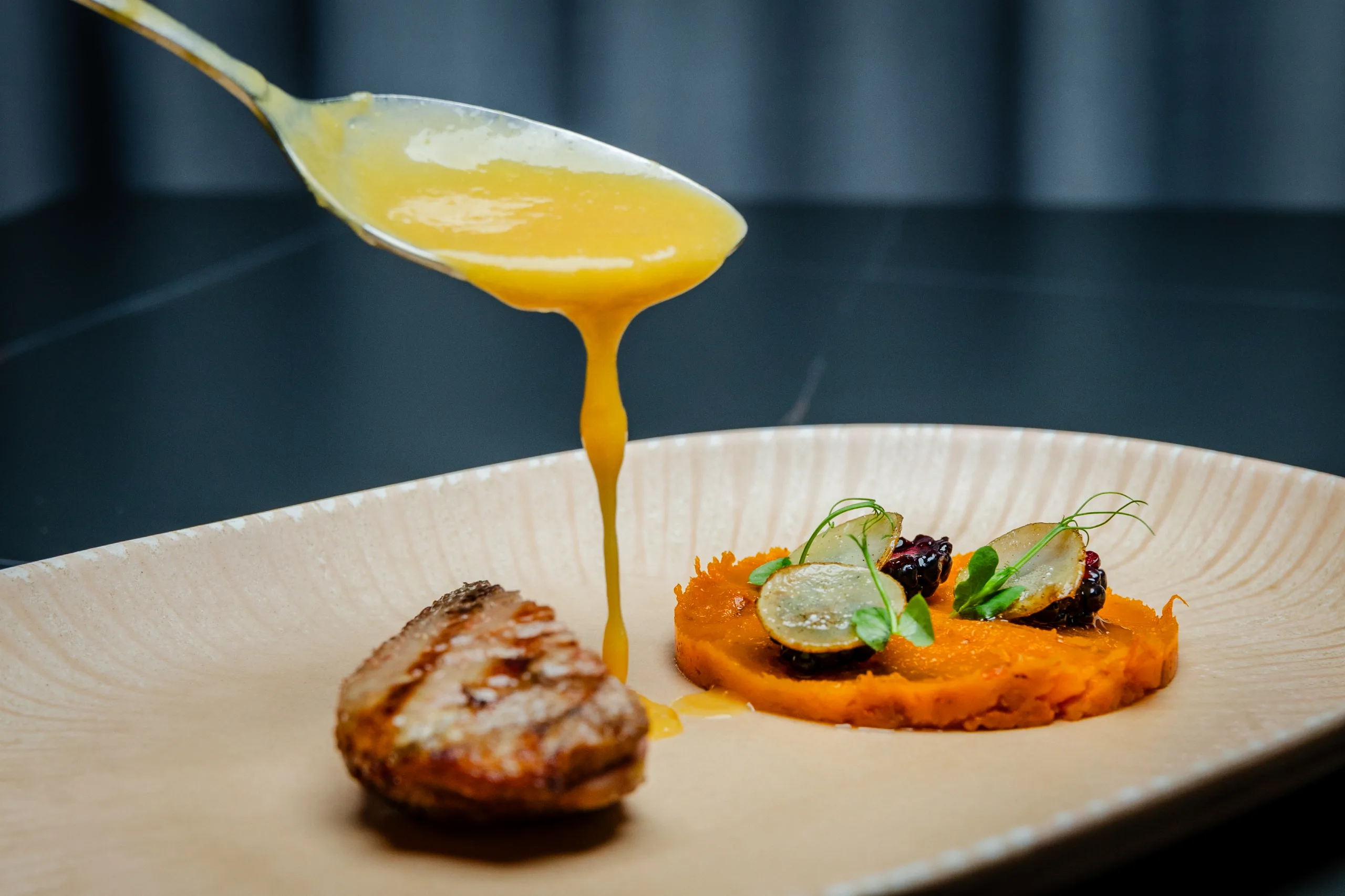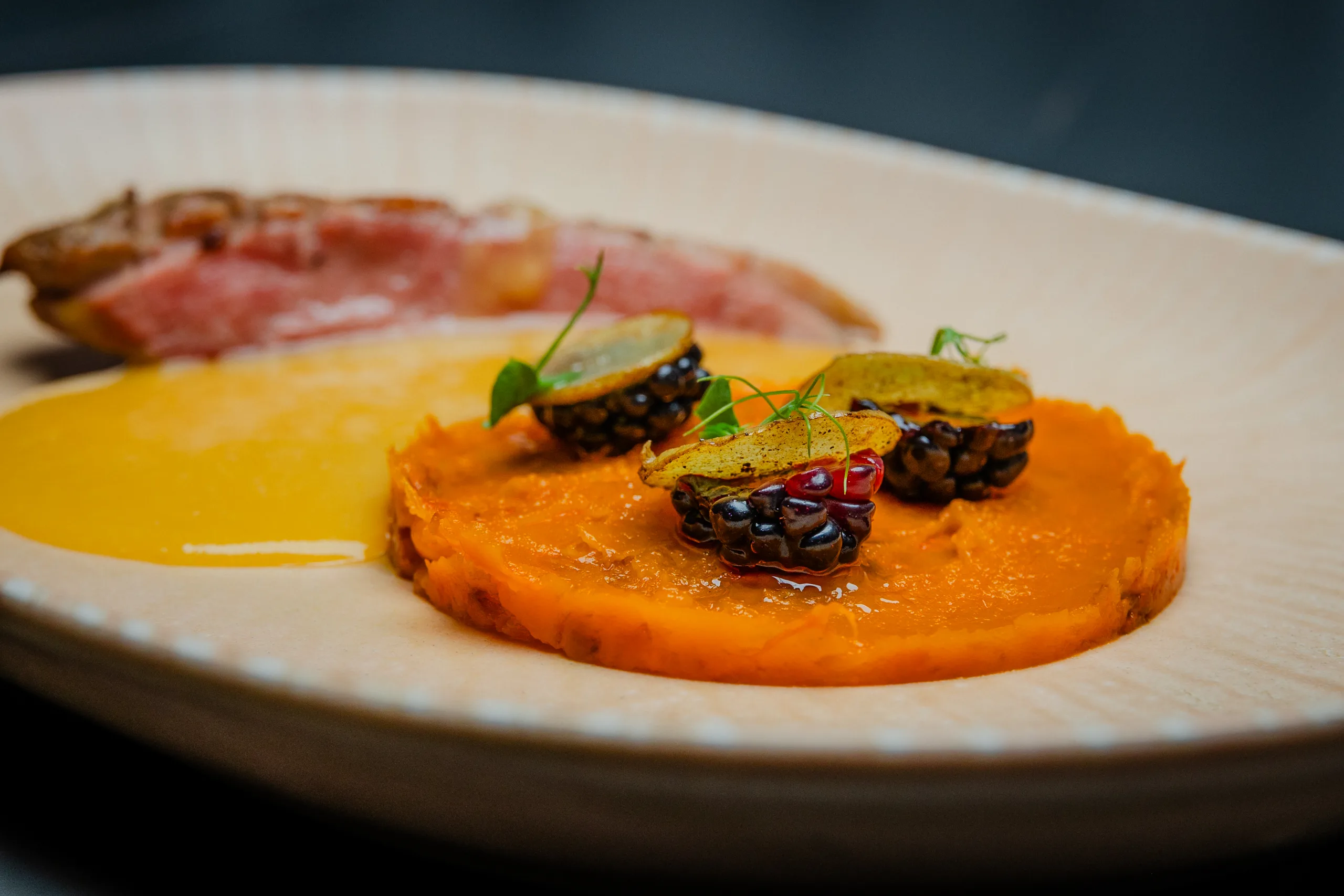 Račja prsa s tartom iz buče, pomarančna omaka in divje robide.