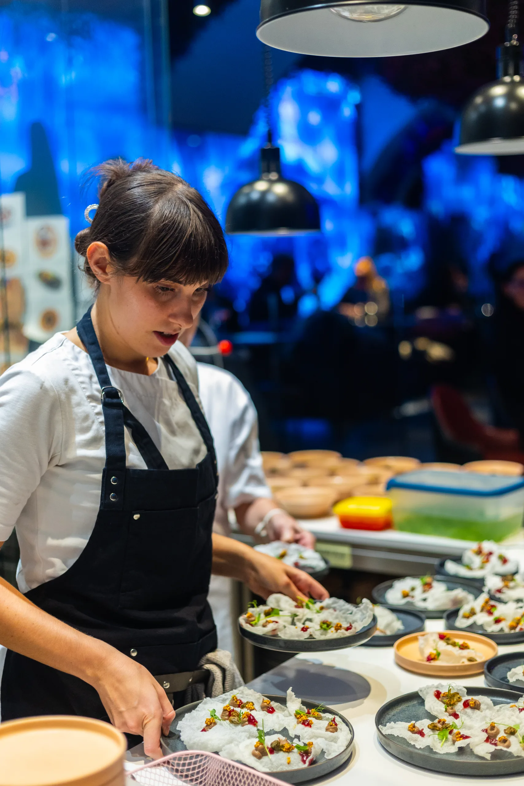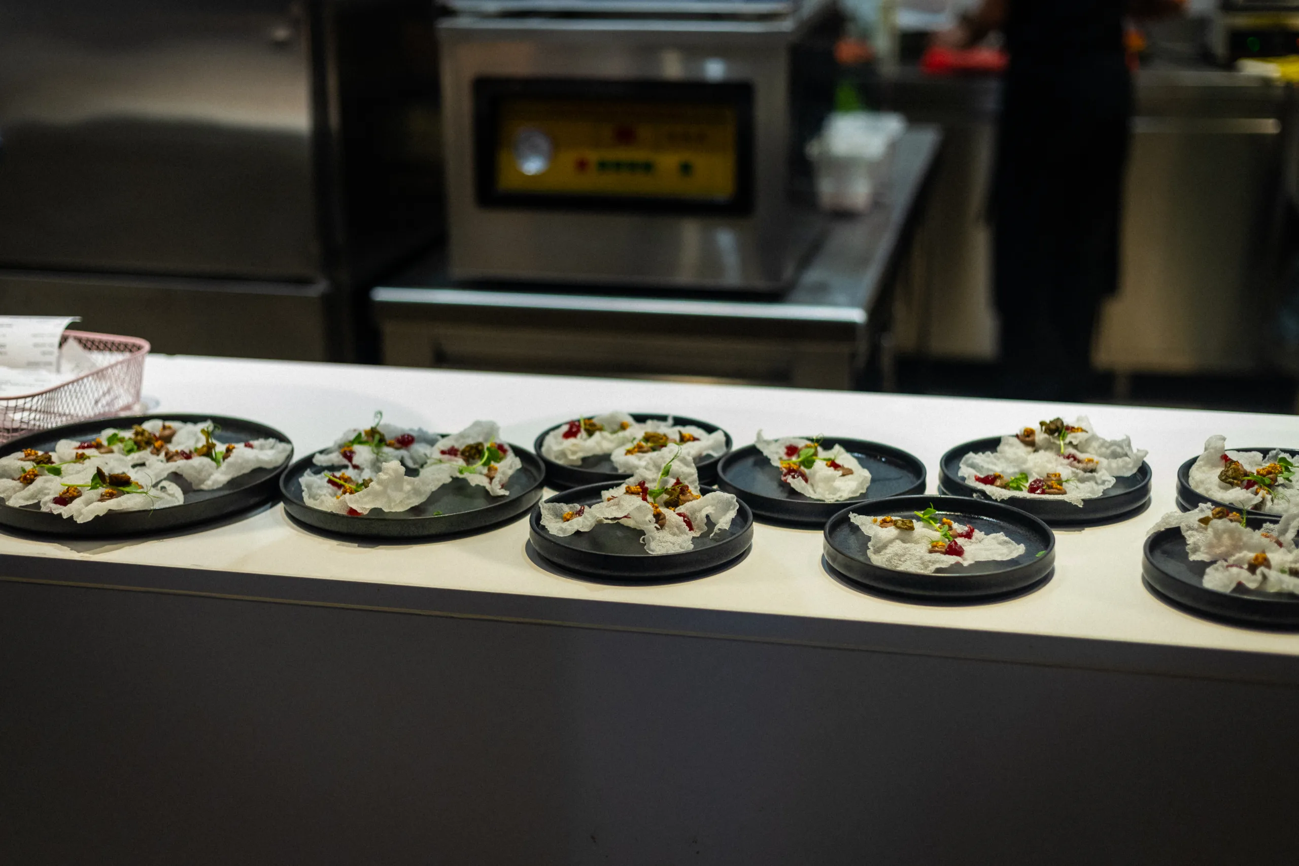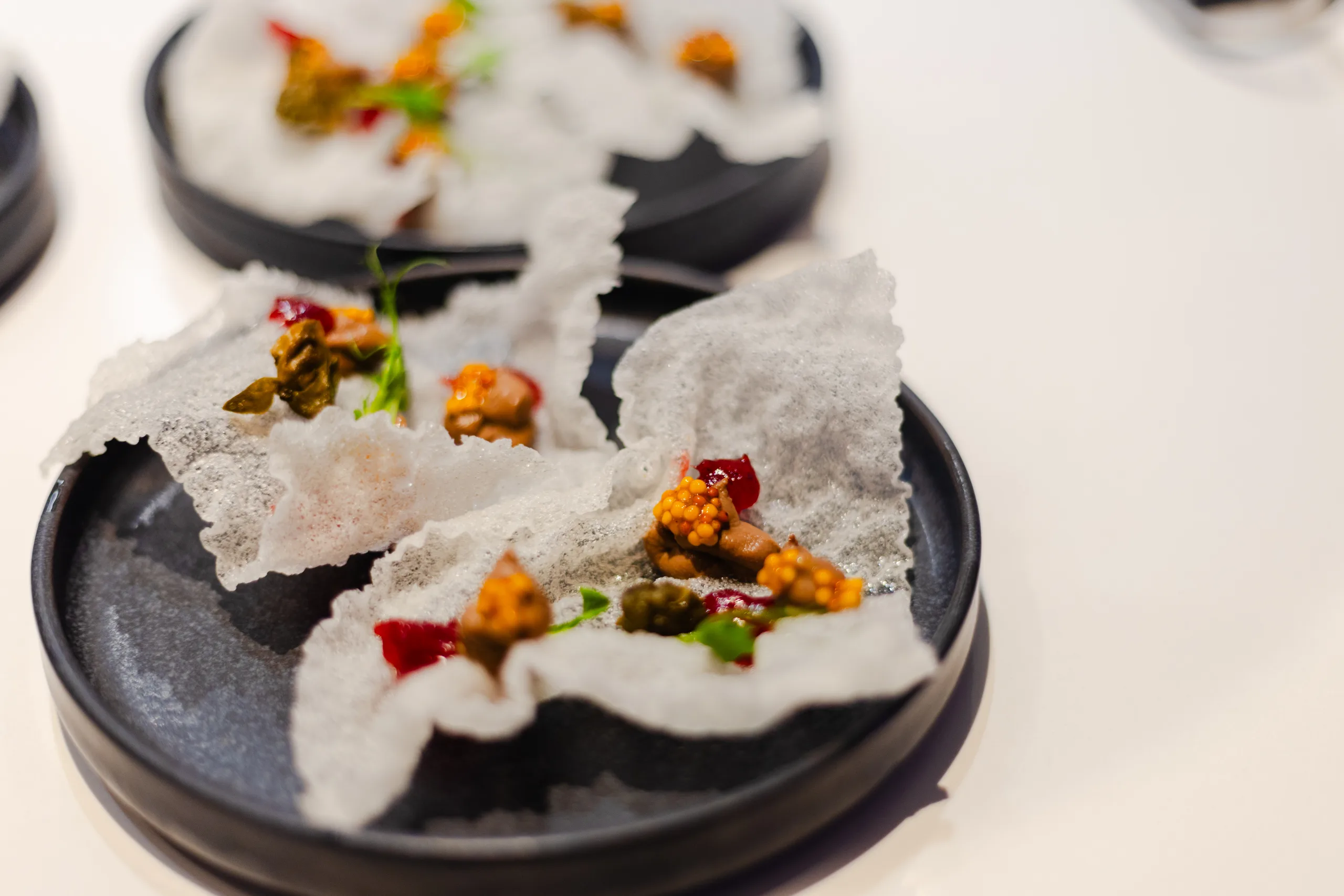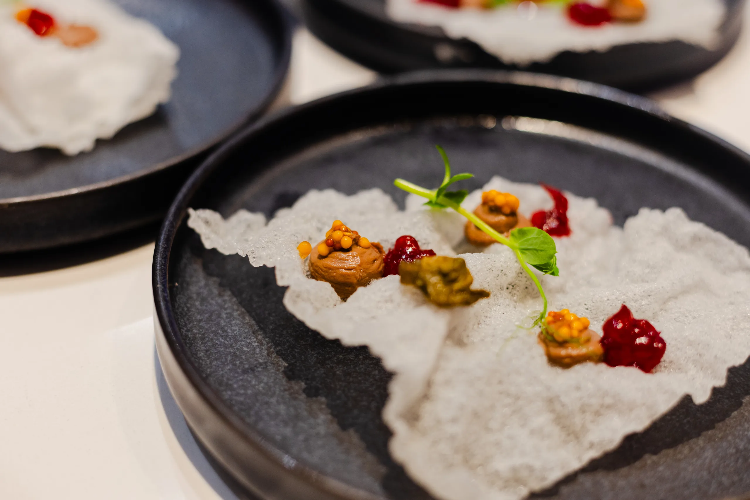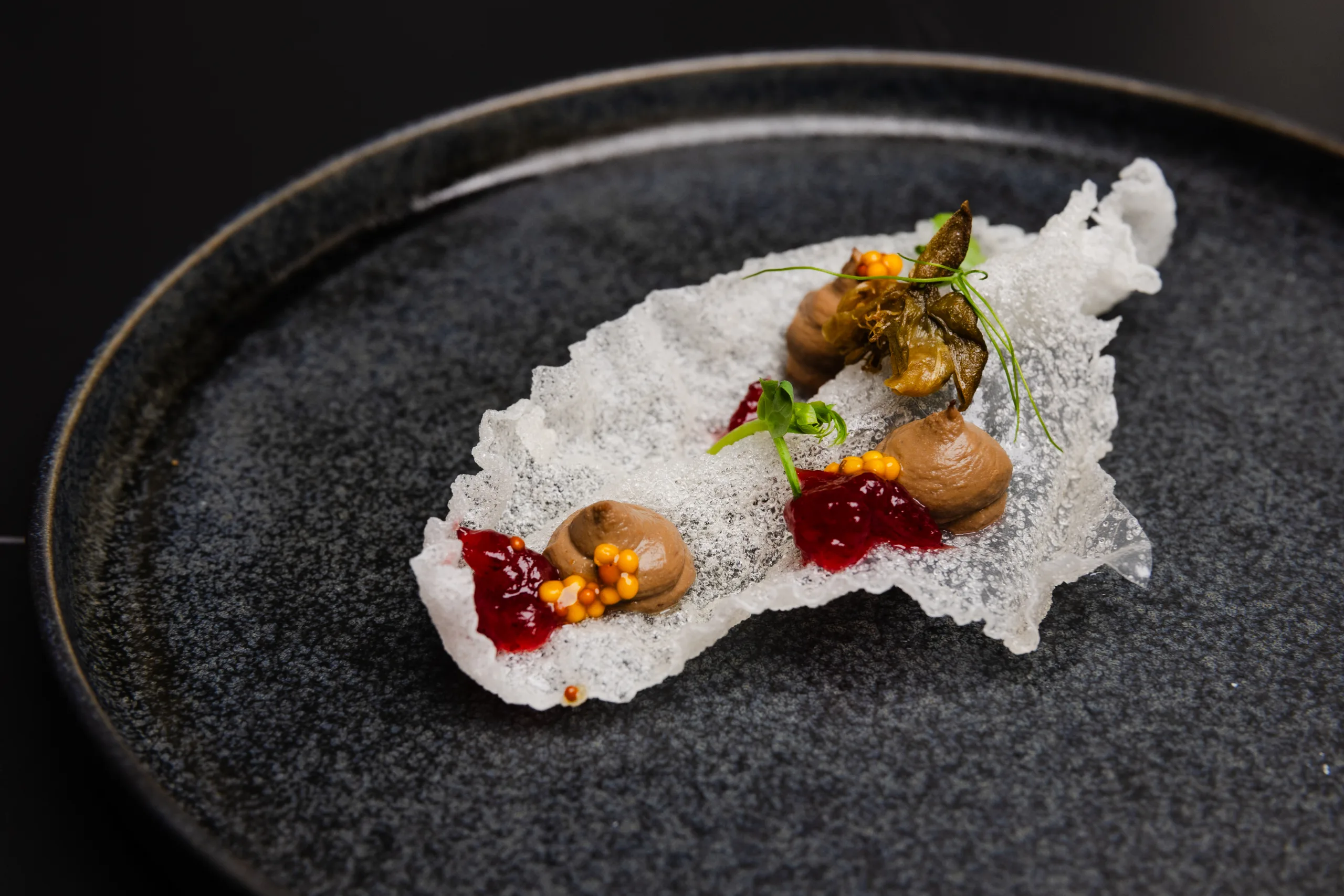 Rižev kreker z račjo pašteto, brusnično maremelado, ocvrtimi kaprami in mikrozelenjem