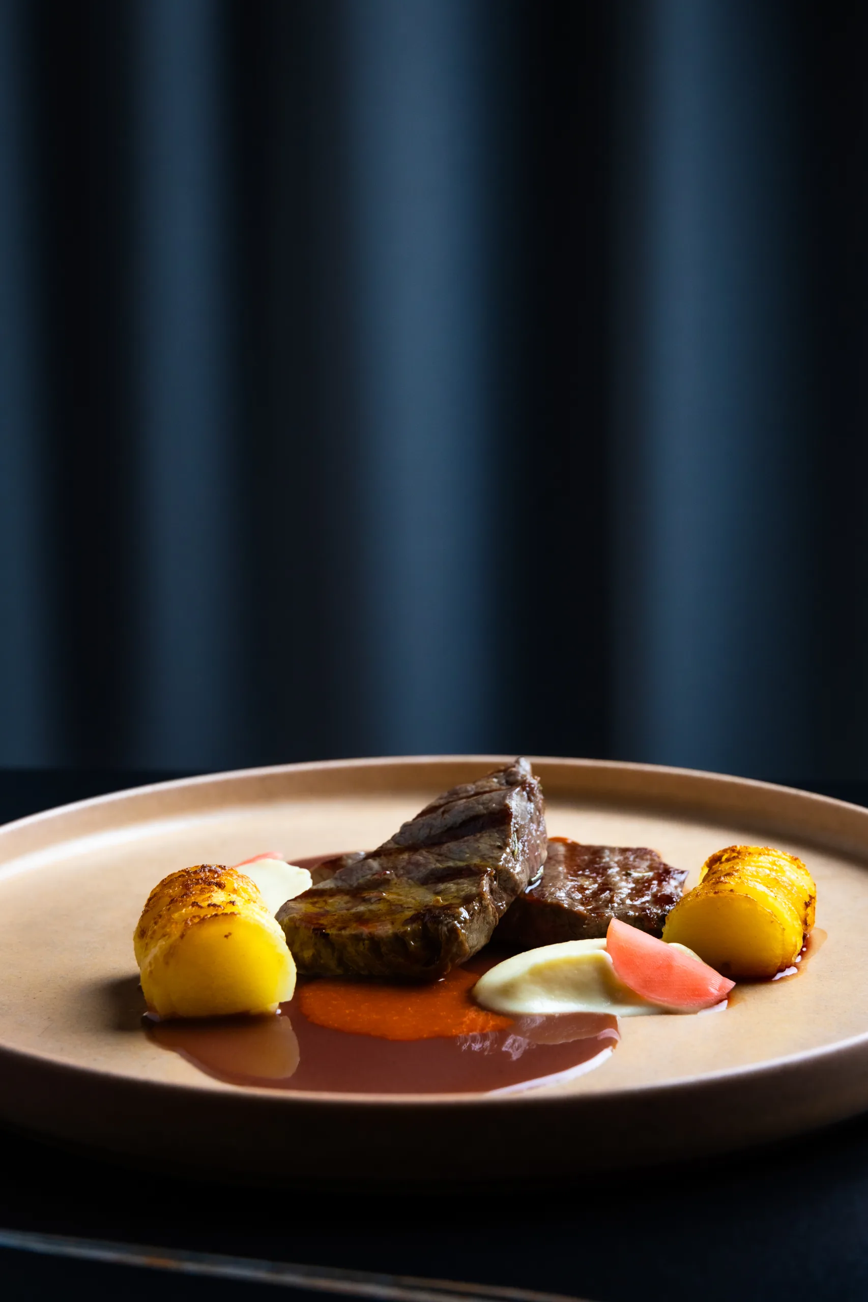 → Glavna zvezda večera. Sočen roastbeef, čudovito pečen krompir in rahlo sladkasta, svilnata korenčkova omaka. Klasična jed v sodobni preobleki.