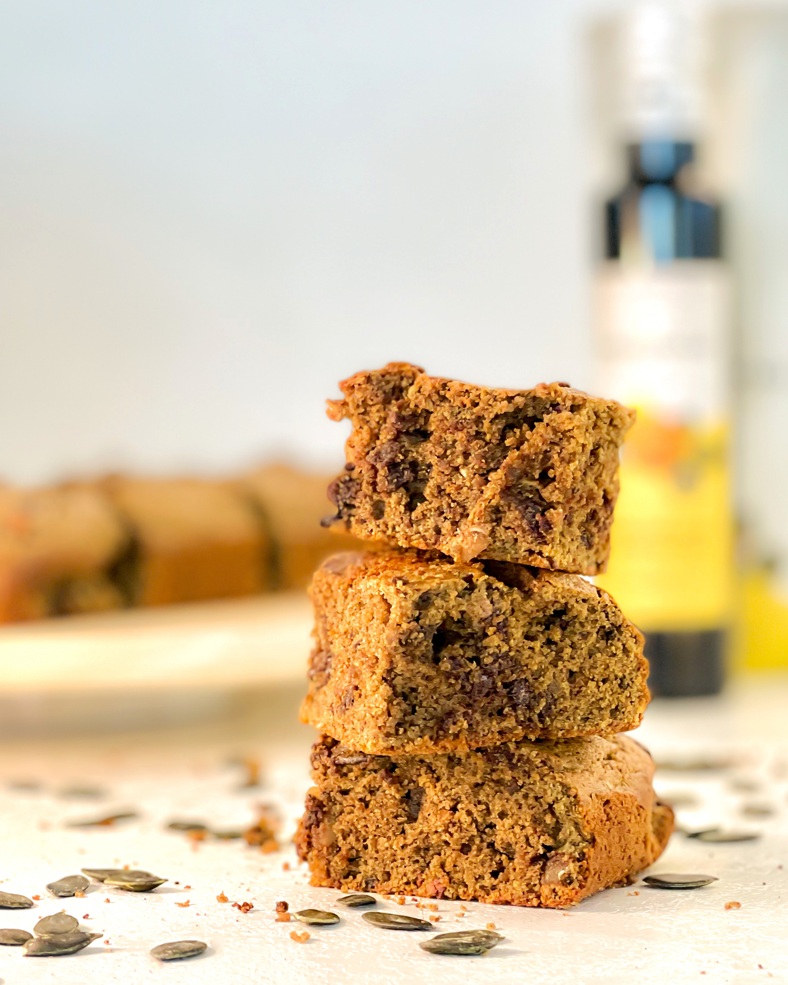 Za bolj intenziven okus bučnega olja ga nežno pogrej (ne segrevaj do vretja!) in z njim premaži vrh brownijev, ko so še topli. Dodaš lahko tudi malo cimeta ali kardamoma v maso – odlično paše z oreščki in čokolado.