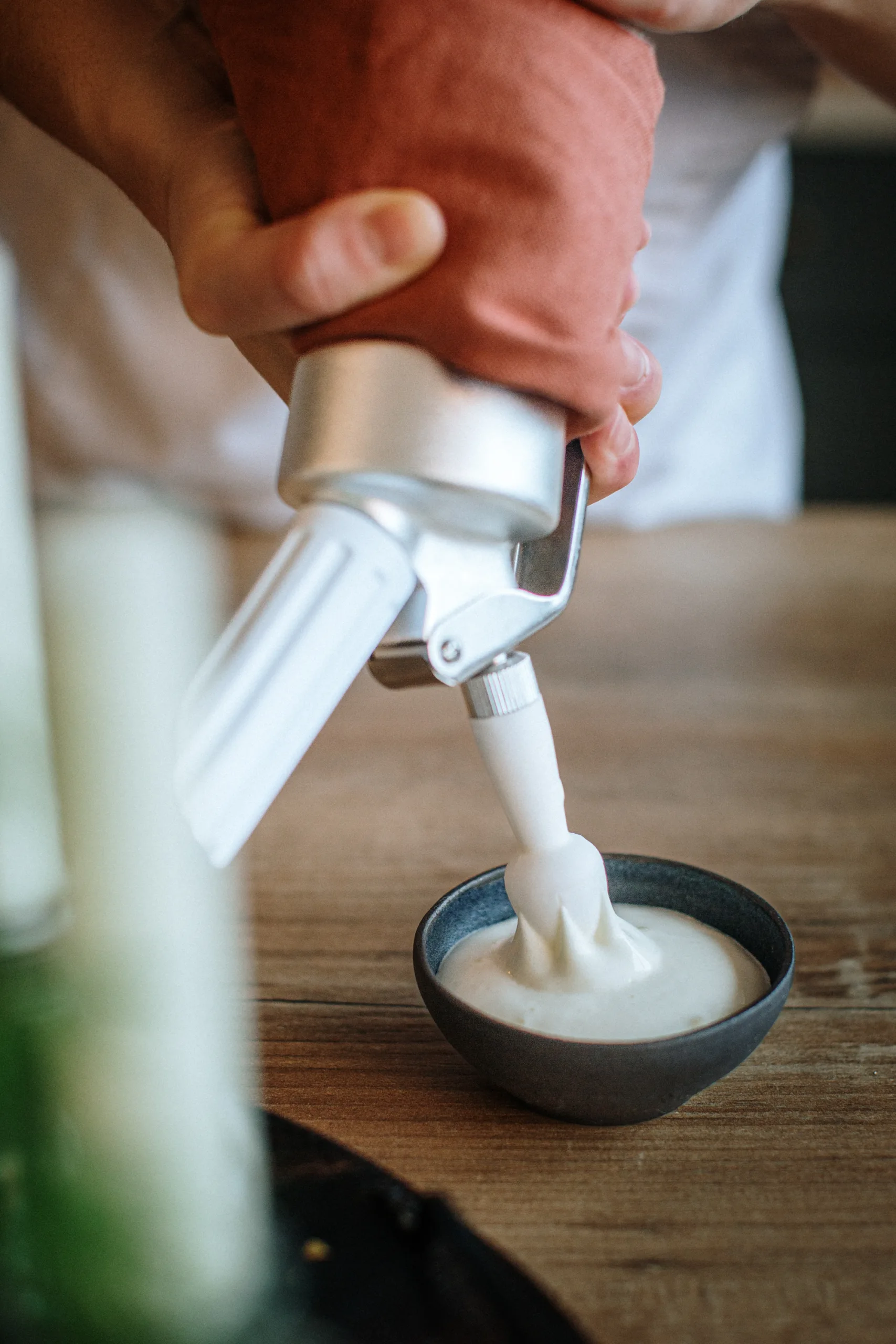 Peno lahko aromatiziraš po želji – na primer z rožmarinom ali timijanom, ki ga med segrevanjem na hitro prevreš v smetani in nato odstraniš. Prav tako lahko zamenjaš polovico smetane z mlekom za lažjo verzijo. In če nimaš sifona? Ohlajeno maso lahko stepeš v rahlo penasto kremo!
