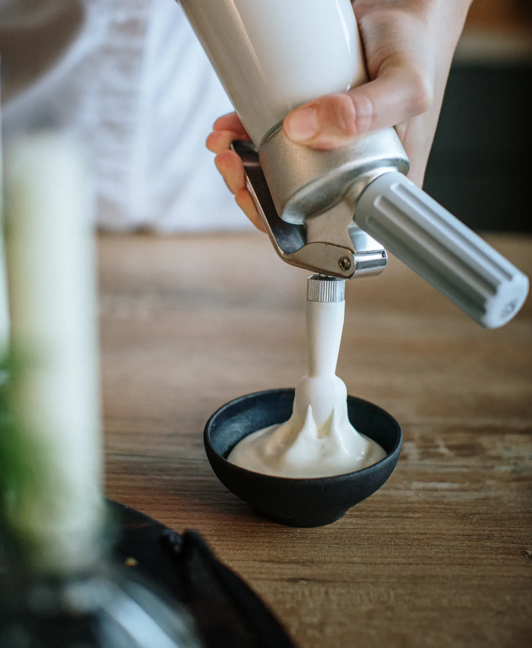 Prelijemo v sifon, zapremo, dodamo eno polnilo (N₂O) in dobro pretresemo.