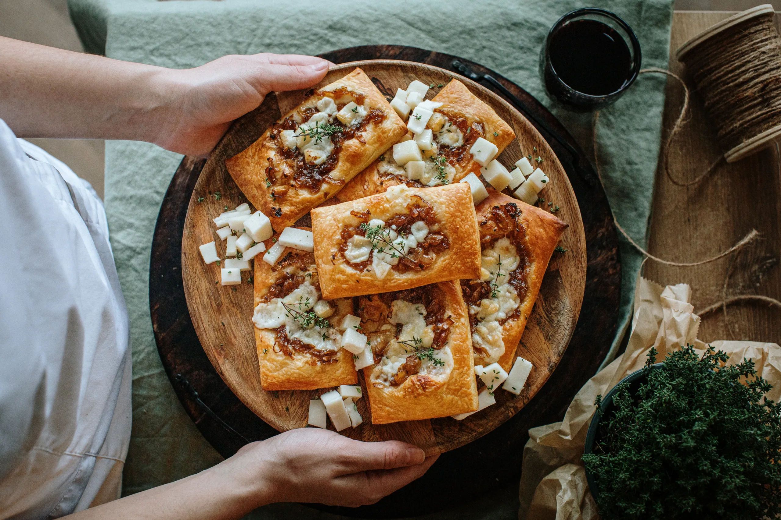 Listnato testo premaži z jajcem ali mešanico smetane in rumenjaka po robovih – s tem boš dobil res lepo zlato-rjavo barvo in dodatno hrustljavost. Če ti ostane kaj karameliziranih šalotk, jih lahko uporabiš tudi kot topping za burgerje, sendviče ali rižote – resnično vsestranske!